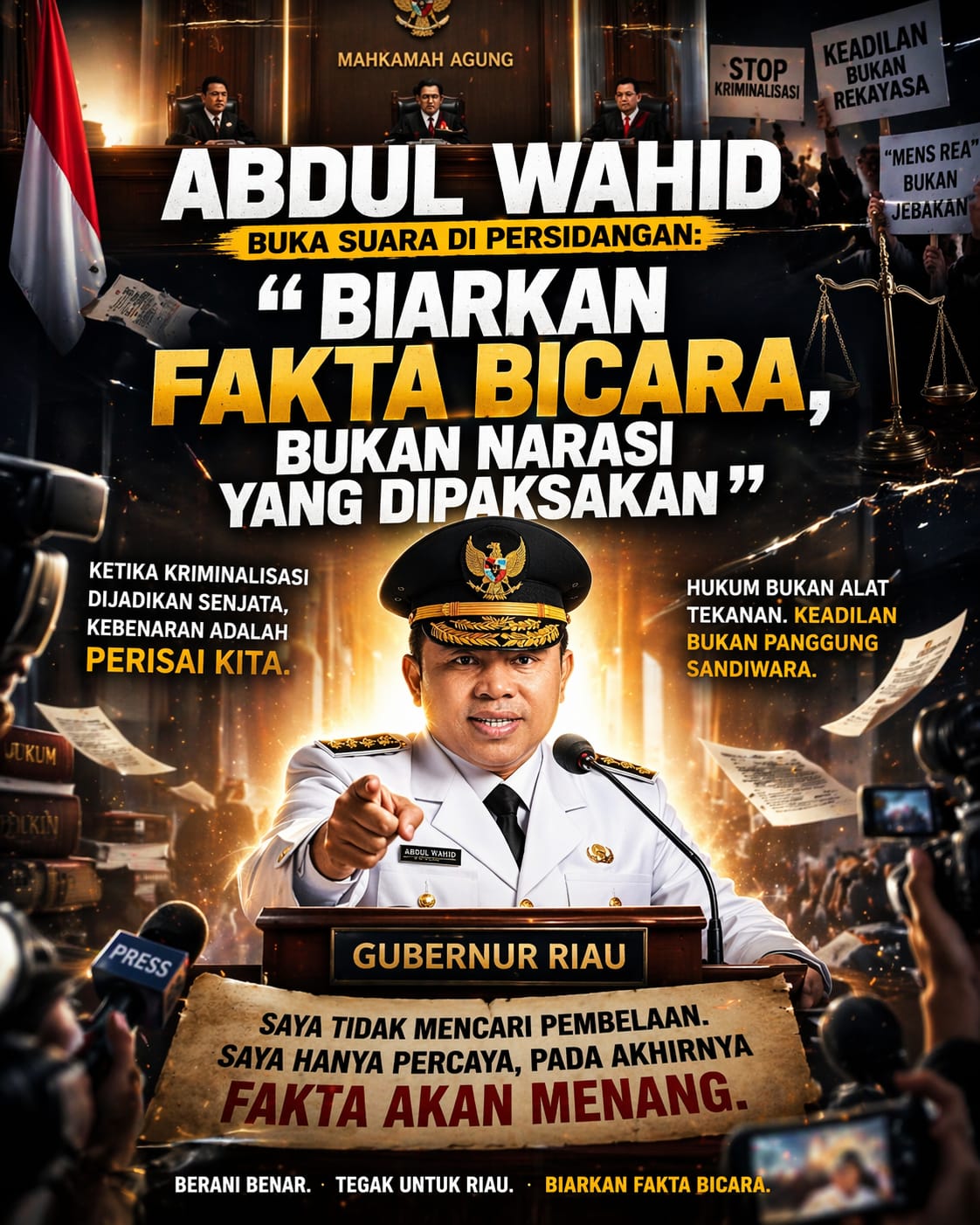perisainegri.Com _ PEKANBARU, Rabu (8/4/2026) – Sosok Abdul Wahid tampil tenang namun penuh ketegasan saat memberikan pernyataan usai menjalani persidangan yang kembali menyita perhatian publik. Di tengah sorotan tajam terhadap kasus yang menjeratnya, Wahid justru memilih membangun narasi pembelaan berbasis fakta, bukan emosi.