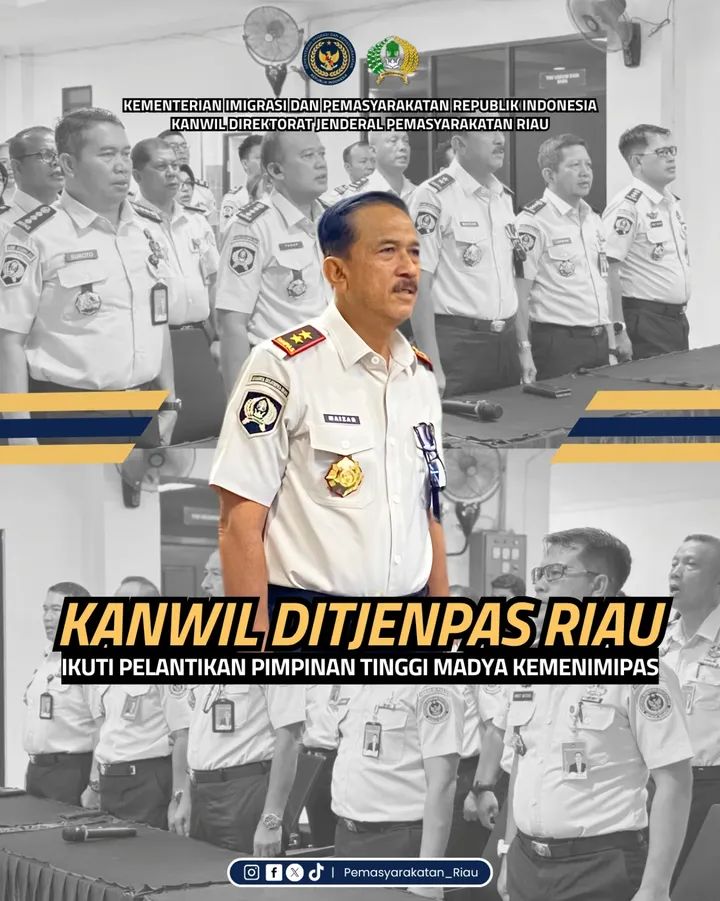 perisainegri.Com & Pekanbaru – Kantor Wilayah Direktorat Jenderal Pemasyarakatan (Kanwil Ditjenpas) Riau mengikuti kegiatan pelantikan dan pengambilan sumpah jabatan Pimpinan Tinggi Madya di lingkungan Kementerian Imigrasi dan Pemasyarakatan yang diselenggarakan secara hybrid pada Rabu (1/4/2026).