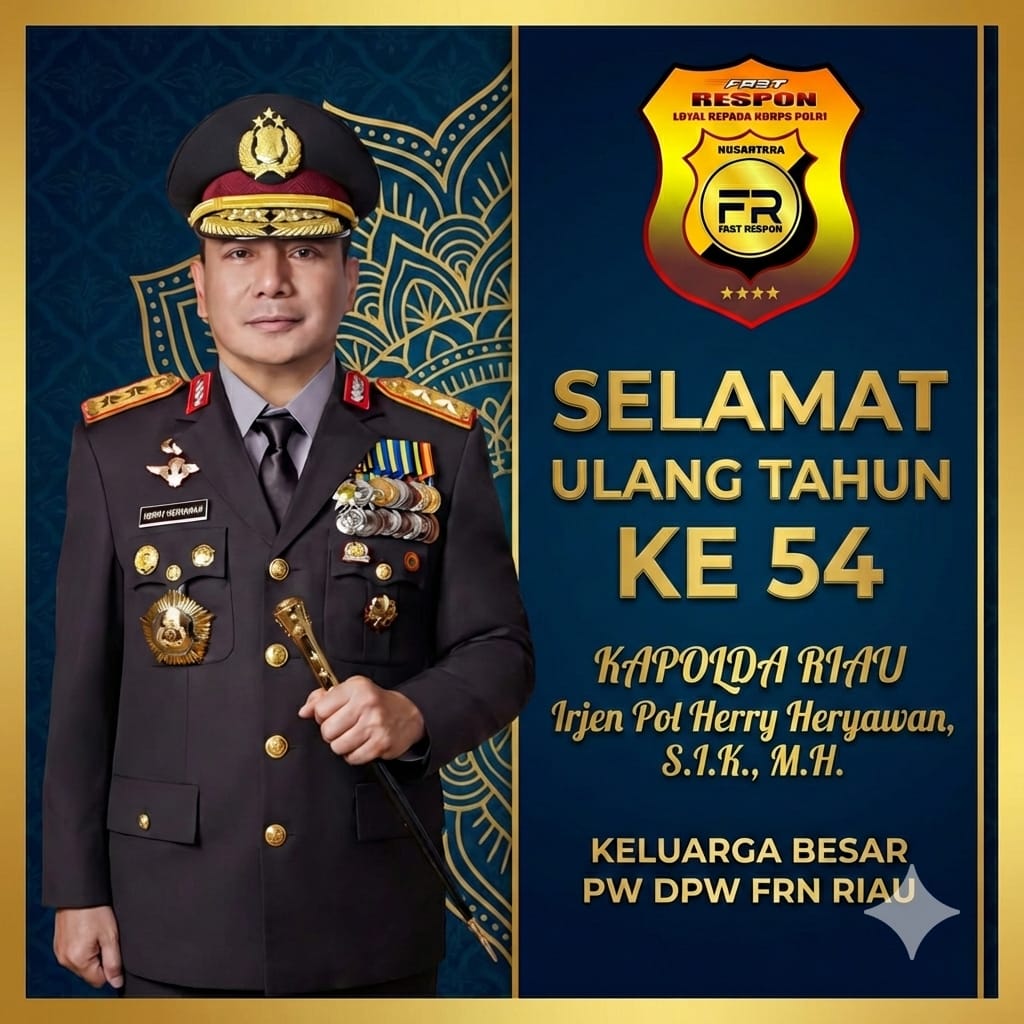 perisainegri.Com _ Pekanbaru – Ketua Perkumpulan Wartawan Fast Respon Nusantara (PW-FRN), wilayah Riau Adam Silaen ,beserta seluruh jajaran pengurus wilayah Riau dan kabupaten menyampaikan ucapan selamat ulang tahun yang ke-54 untuk Kapolda Riau Irjen pol Herry Heryawan S.I.K M.H.